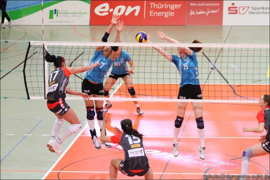 […] Was mag durch die Köpfe von Volleyballspielerinnen gehen, wenn das Team plötzlich ohne Europameisterin auf einer Schlüsselposition auskommen muss? Und was erst, wenn das mühsam erarbeitete “neue System” dann plötzlich durch eine Verletzung mitten im Wettkampf zusammenbricht? Für die Mädels vom VfB Suhl gilt : Ganz kurz schütteln, dann neu durchatmen – weiter geht’s mit den noch verbliebenen, aber vereinten Kräften. Das was sich im Vorfeld und dann gestern abend beim Meisterschaftspiel in der 1. Bundesliga gegen Alemannia Aachen abspielte, kann mit Recht als ungewöhnlich im Spitzenvolleyball bezeichnet werden. Zunächst steht eine Mannschaft ohne Libera, dafür mit vier “Lateral-Angreiferinnen” (Zitat des Scouts) auf dem Feld und bringt den Gegner ins Grübeln. Das läuft auch glänzend. Anfang des zweiten Satzes kommt aber ein neuer “Tiefschlag”. Wegen Verletzung fällt eine Spielerin dieses Systems (Gute Besserung, Steffi!) auch noch aus. Nun ist guter Rat teuer. Nichts da, eine Mittelblockerin(!) wird in die Annahme delegiert und erledigt ihre Aufgabe mit Bravour. Das gesamte Team reagiert äußerst flexibel und fightet gemeinsam den starken Gegner nieder. Der Trainer zeigte sich nach dem Spiel restlos begeistert von seinen Girls. Diese noch sehr junge Truppe hatte gerade im Stile von Routiniers alle Probleme “weggefegt” und sich am Ende durchgesetzt. Das Publikum in der Wolfsgrube ließ sich vom Auftreten der Mädels und dem des pausenlos aktiven Fanblocks mitreißen, stand teilweise lange vor dem “üblichen” Zeitpunkt (23.Punkt) auf und unterstützte die Truppe auf dem Feld. Am Ende gab es nur noch Freudentaumel. Ein hochemotionaler Abend mit einem denkwürdigen Spiel war vorbei. Vielleicht kann man sich sogar dazu hinreißen lassen und sagen: “An diesem Abend wurde Bundesliga-Historie geschrieben.” Wir sind stolz auf euch, Mädels! Dynamics Multimedia: Bilder zum Spiel gibt es in unserer Galerie (c) René… […]