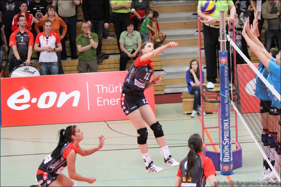 […] Was mag durch die Köpfe von Volleyballspielerinnen gehen, wenn das Team plötzlich ohne Europameisterin auf einer Schlüsselposition auskommen muss? Und was erst, wenn das mühsam erarbeitete “neue System” dann plötzlich durch eine Verletzung mitten im Wettkampf zusammenbricht? Für die Mädels vom VfB Suhl gilt : Ganz kurz schütteln, dann neu durchatmen – weiter geht’s mit den noch verbliebenen, aber vereinten Kräften. Das was sich im Vorfeld und dann gestern abend beim Meisterschaftspiel in der 1. Bundesliga gegen Alemannia Aachen abspielte, kann mit Recht als ungewöhnlich im Spitzenvolleyball bezeichnet werden. Zunächst steht eine Mannschaft ohne Libera, dafür mit vier “Lateral-Angreiferinnen” (Zitat des Scouts) auf dem Feld und bringt den Gegner ins Grübeln. Das läuft auch glänzend. Anfang des zweiten Satzes kommt aber ein neuer “Tiefschlag”. Wegen Verletzung fällt eine Spielerin dieses Systems (Gute Besserung, Steffi!) auch noch aus. Nun ist guter Rat teuer. Nichts da, eine Mittelblockerin(!) wird in die Annahme delegiert und erledigt ihre Aufgabe mit Bravour. Das gesamte Team reagiert äußerst flexibel und fightet gemeinsam den starken Gegner nieder. Der Trainer zeigte sich nach dem Spiel restlos begeistert von seinen Girls. Diese noch sehr junge Truppe hatte gerade im Stile von Routiniers alle Probleme “weggefegt” und sich am Ende durchgesetzt. Das Publikum in der Wolfsgrube ließ sich vom Auftreten der Mädels und dem des pausenlos aktiven Fanblocks mitreißen, stand teilweise lange vor dem “üblichen” Zeitpunkt (23.Punkt) auf und unterstützte die Truppe auf dem Feld. Am Ende gab es nur noch Freudentaumel. Ein hochemotionaler Abend mit einem denkwürdigen Spiel war vorbei. Vielleicht kann man sich sogar dazu hinreißen lassen und sagen: “An diesem Abend wurde Bundesliga-Historie geschrieben.” Wir sind stolz auf euch, Mädels! Dynamics Multimedia: Bilder zum Spiel gibt es in unserer Galerie (c) René… […]