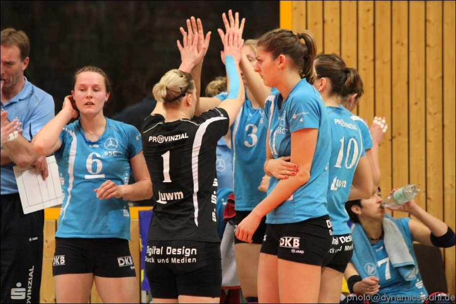 […] Was mag durch die Köpfe von Volleyballspielerinnen gehen, wenn das Team plötzlich ohne Europameisterin auf einer Schlüsselposition auskommen muss? Und was erst, wenn das mühsam erarbeitete “neue System” dann plötzlich durch eine Verletzung mitten im Wettkampf zusammenbricht? Für die Mädels vom VfB Suhl gilt : Ganz kurz schütteln, dann neu durchatmen – weiter geht’s mit den noch verbliebenen, aber vereinten Kräften. Das was sich im Vorfeld und dann gestern abend beim Meisterschaftspiel in der 1. Bundesliga gegen Alemannia Aachen abspielte, kann mit Recht als ungewöhnlich im Spitzenvolleyball bezeichnet werden. Zunächst steht eine Mannschaft ohne Libera, dafür mit vier “Lateral-Angreiferinnen” (Zitat des Scouts) auf dem Feld und bringt den Gegner ins Grübeln. Das läuft auch glänzend. Anfang des zweiten Satzes kommt aber ein neuer “Tiefschlag”. Wegen Verletzung fällt eine Spielerin dieses Systems (Gute Besserung, Steffi!) auch noch aus. Nun ist guter Rat teuer. Nichts da, eine Mittelblockerin(!) wird in die Annahme delegiert und erledigt ihre Aufgabe mit Bravour. Das gesamte Team reagiert äußerst flexibel und fightet gemeinsam den starken Gegner nieder. Der Trainer zeigte sich nach dem Spiel restlos begeistert von seinen Girls. Diese noch sehr junge Truppe hatte gerade im Stile von Routiniers alle Probleme “weggefegt” und sich am Ende durchgesetzt. Das Publikum in der Wolfsgrube ließ sich vom Auftreten der Mädels und dem des pausenlos aktiven Fanblocks mitreißen, stand teilweise lange vor dem “üblichen” Zeitpunkt (23.Punkt) auf und unterstützte die Truppe auf dem Feld. Am Ende gab es nur noch Freudentaumel. Ein hochemotionaler Abend mit einem denkwürdigen Spiel war vorbei. Vielleicht kann man sich sogar dazu hinreißen lassen und sagen: “An diesem Abend wurde Bundesliga-Historie geschrieben.” Wir sind stolz auf euch, Mädels! Dynamics Multimedia: Bilder zum Spiel gibt es in unserer Galerie (c) René… […]