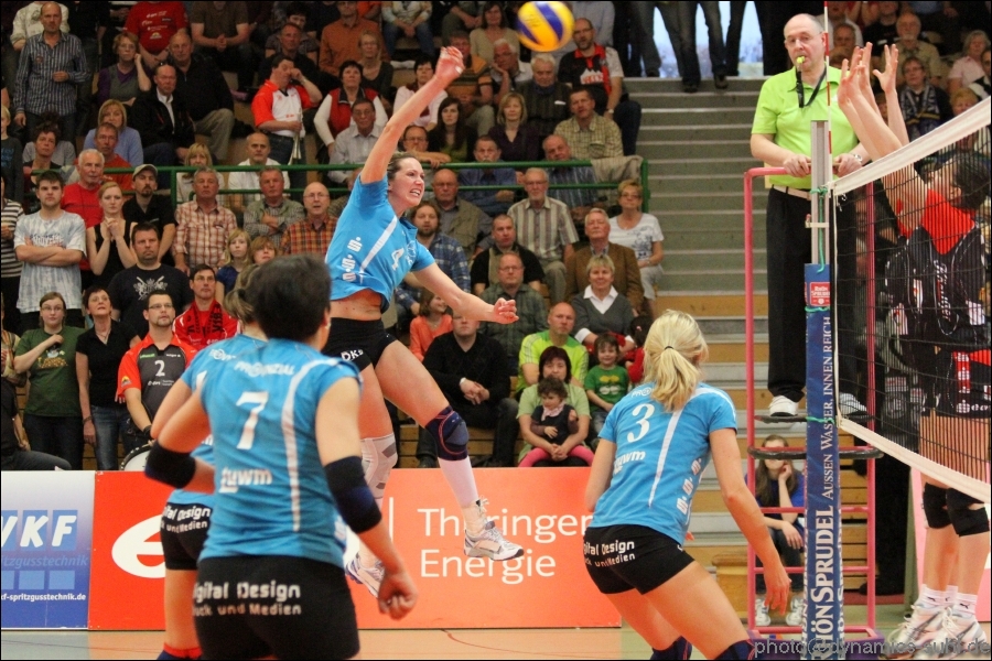 […] Was mag durch die Köpfe von Volleyballspielerinnen gehen, wenn das Team plötzlich ohne Europameisterin auf einer Schlüsselposition auskommen muss? Und was erst, wenn das mühsam erarbeitete “neue System” dann plötzlich durch eine Verletzung mitten im Wettkampf zusammenbricht? Für die Mädels vom VfB Suhl gilt : Ganz kurz schütteln, dann neu durchatmen – weiter geht’s mit den noch verbliebenen, aber vereinten Kräften. Das was sich im Vorfeld und dann gestern abend beim Meisterschaftspiel in der 1. Bundesliga gegen Alemannia Aachen abspielte, kann mit Recht als ungewöhnlich im Spitzenvolleyball bezeichnet werden. Zunächst steht eine Mannschaft ohne Libera, dafür mit vier “Lateral-Angreiferinnen” (Zitat des Scouts) auf dem Feld und bringt den Gegner ins Grübeln. Das läuft auch glänzend. Anfang des zweiten Satzes kommt aber ein neuer “Tiefschlag”. Wegen Verletzung fällt eine Spielerin dieses Systems (Gute Besserung, Steffi!) auch noch aus. Nun ist guter Rat teuer. Nichts da, eine Mittelblockerin(!) wird in die Annahme delegiert und erledigt ihre Aufgabe mit Bravour. Das gesamte Team reagiert äußerst flexibel und fightet gemeinsam den starken Gegner nieder. Der Trainer zeigte sich nach dem Spiel restlos begeistert von seinen Girls. Diese noch sehr junge Truppe hatte gerade im Stile von Routiniers alle Probleme “weggefegt” und sich am Ende durchgesetzt. Das Publikum in der Wolfsgrube ließ sich vom Auftreten der Mädels und dem des pausenlos aktiven Fanblocks mitreißen, stand teilweise lange vor dem “üblichen” Zeitpunkt (23.Punkt) auf und unterstützte die Truppe auf dem Feld. Am Ende gab es nur noch Freudentaumel. Ein hochemotionaler Abend mit einem denkwürdigen Spiel war vorbei. Vielleicht kann man sich sogar dazu hinreißen lassen und sagen: “An diesem Abend wurde Bundesliga-Historie geschrieben.” Wir sind stolz auf euch, Mädels! Dynamics Multimedia: Bilder zum Spiel gibt es in unserer Galerie (c) René… […]