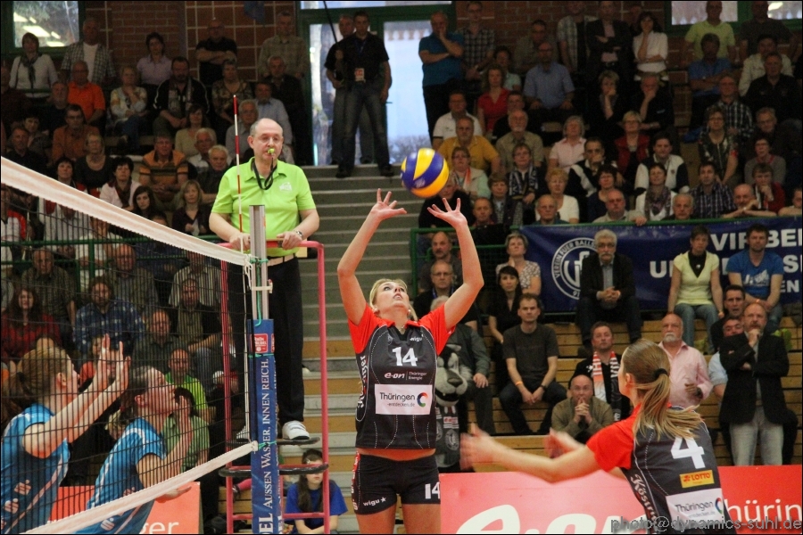 […] Was mag durch die Köpfe von Volleyballspielerinnen gehen, wenn das Team plötzlich ohne Europameisterin auf einer Schlüsselposition auskommen muss? Und was erst, wenn das mühsam erarbeitete “neue System” dann plötzlich durch eine Verletzung mitten im Wettkampf zusammenbricht? Für die Mädels vom VfB Suhl gilt : Ganz kurz schütteln, dann neu durchatmen – weiter geht’s mit den noch verbliebenen, aber vereinten Kräften. Das was sich im Vorfeld und dann gestern abend beim Meisterschaftspiel in der 1. Bundesliga gegen Alemannia Aachen abspielte, kann mit Recht als ungewöhnlich im Spitzenvolleyball bezeichnet werden. Zunächst steht eine Mannschaft ohne Libera, dafür mit vier “Lateral-Angreiferinnen” (Zitat des Scouts) auf dem Feld und bringt den Gegner ins Grübeln. Das läuft auch glänzend. Anfang des zweiten Satzes kommt aber ein neuer “Tiefschlag”. Wegen Verletzung fällt eine Spielerin dieses Systems (Gute Besserung, Steffi!) auch noch aus. Nun ist guter Rat teuer. Nichts da, eine Mittelblockerin(!) wird in die Annahme delegiert und erledigt ihre Aufgabe mit Bravour. Das gesamte Team reagiert äußerst flexibel und fightet gemeinsam den starken Gegner nieder. Der Trainer zeigte sich nach dem Spiel restlos begeistert von seinen Girls. Diese noch sehr junge Truppe hatte gerade im Stile von Routiniers alle Probleme “weggefegt” und sich am Ende durchgesetzt. Das Publikum in der Wolfsgrube ließ sich vom Auftreten der Mädels und dem des pausenlos aktiven Fanblocks mitreißen, stand teilweise lange vor dem “üblichen” Zeitpunkt (23.Punkt) auf und unterstützte die Truppe auf dem Feld. Am Ende gab es nur noch Freudentaumel. Ein hochemotionaler Abend mit einem denkwürdigen Spiel war vorbei. Vielleicht kann man sich sogar dazu hinreißen lassen und sagen: “An diesem Abend wurde Bundesliga-Historie geschrieben.” Wir sind stolz auf euch, Mädels! Dynamics Multimedia: Bilder zum Spiel gibt es in unserer Galerie (c) René… […]
