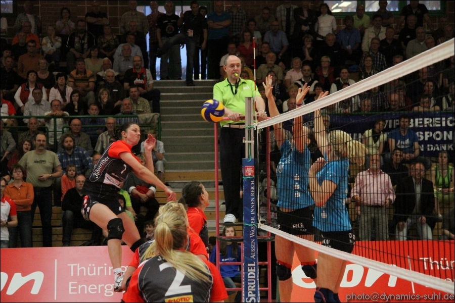 […] Was mag durch die Köpfe von Volleyballspielerinnen gehen, wenn das Team plötzlich ohne Europameisterin auf einer Schlüsselposition auskommen muss? Und was erst, wenn das mühsam erarbeitete “neue System” dann plötzlich durch eine Verletzung mitten im Wettkampf zusammenbricht? Für die Mädels vom VfB Suhl gilt : Ganz kurz schütteln, dann neu durchatmen – weiter geht’s mit den noch verbliebenen, aber vereinten Kräften. Das was sich im Vorfeld und dann gestern abend beim Meisterschaftspiel in der 1. Bundesliga gegen Alemannia Aachen abspielte, kann mit Recht als ungewöhnlich im Spitzenvolleyball bezeichnet werden. Zunächst steht eine Mannschaft ohne Libera, dafür mit vier “Lateral-Angreiferinnen” (Zitat des Scouts) auf dem Feld und bringt den Gegner ins Grübeln. Das läuft auch glänzend. Anfang des zweiten Satzes kommt aber ein neuer “Tiefschlag”. Wegen Verletzung fällt eine Spielerin dieses Systems (Gute Besserung, Steffi!) auch noch aus. Nun ist guter Rat teuer. Nichts da, eine Mittelblockerin(!) wird in die Annahme delegiert und erledigt ihre Aufgabe mit Bravour. Das gesamte Team reagiert äußerst flexibel und fightet gemeinsam den starken Gegner nieder. Der Trainer zeigte sich nach dem Spiel restlos begeistert von seinen Girls. Diese noch sehr junge Truppe hatte gerade im Stile von Routiniers alle Probleme “weggefegt” und sich am Ende durchgesetzt. Das Publikum in der Wolfsgrube ließ sich vom Auftreten der Mädels und dem des pausenlos aktiven Fanblocks mitreißen, stand teilweise lange vor dem “üblichen” Zeitpunkt (23.Punkt) auf und unterstützte die Truppe auf dem Feld. Am Ende gab es nur noch Freudentaumel. Ein hochemotionaler Abend mit einem denkwürdigen Spiel war vorbei. Vielleicht kann man sich sogar dazu hinreißen lassen und sagen: “An diesem Abend wurde Bundesliga-Historie geschrieben.” Wir sind stolz auf euch, Mädels! Dynamics Multimedia: Bilder zum Spiel gibt es in unserer Galerie (c) René… […]