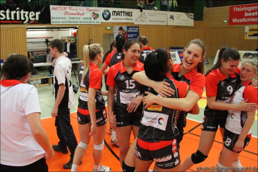 […] Was mag durch die Köpfe von Volleyballspielerinnen gehen, wenn das Team plötzlich ohne Europameisterin auf einer Schlüsselposition auskommen muss? Und was erst, wenn das mühsam erarbeitete “neue System” dann plötzlich durch eine Verletzung mitten im Wettkampf zusammenbricht? Für die Mädels vom VfB Suhl gilt : Ganz kurz schütteln, dann neu durchatmen – weiter geht’s mit den noch verbliebenen, aber vereinten Kräften. Das was sich im Vorfeld und dann gestern abend beim Meisterschaftspiel in der 1. Bundesliga gegen Alemannia Aachen abspielte, kann mit Recht als ungewöhnlich im Spitzenvolleyball bezeichnet werden. Zunächst steht eine Mannschaft ohne Libera, dafür mit vier “Lateral-Angreiferinnen” (Zitat des Scouts) auf dem Feld und bringt den Gegner ins Grübeln. Das läuft auch glänzend. Anfang des zweiten Satzes kommt aber ein neuer “Tiefschlag”. Wegen Verletzung fällt eine Spielerin dieses Systems (Gute Besserung, Steffi!) auch noch aus. Nun ist guter Rat teuer. Nichts da, eine Mittelblockerin(!) wird in die Annahme delegiert und erledigt ihre Aufgabe mit Bravour. Das gesamte Team reagiert äußerst flexibel und fightet gemeinsam den starken Gegner nieder. Der Trainer zeigte sich nach dem Spiel restlos begeistert von seinen Girls. Diese noch sehr junge Truppe hatte gerade im Stile von Routiniers alle Probleme “weggefegt” und sich am Ende durchgesetzt. Das Publikum in der Wolfsgrube ließ sich vom Auftreten der Mädels und dem des pausenlos aktiven Fanblocks mitreißen, stand teilweise lange vor dem “üblichen” Zeitpunkt (23.Punkt) auf und unterstützte die Truppe auf dem Feld. Am Ende gab es nur noch Freudentaumel. Ein hochemotionaler Abend mit einem denkwürdigen Spiel war vorbei. Vielleicht kann man sich sogar dazu hinreißen lassen und sagen: “An diesem Abend wurde Bundesliga-Historie geschrieben.” Wir sind stolz auf euch, Mädels! Dynamics Multimedia: Bilder zum Spiel gibt es in unserer Galerie (c) René… […]